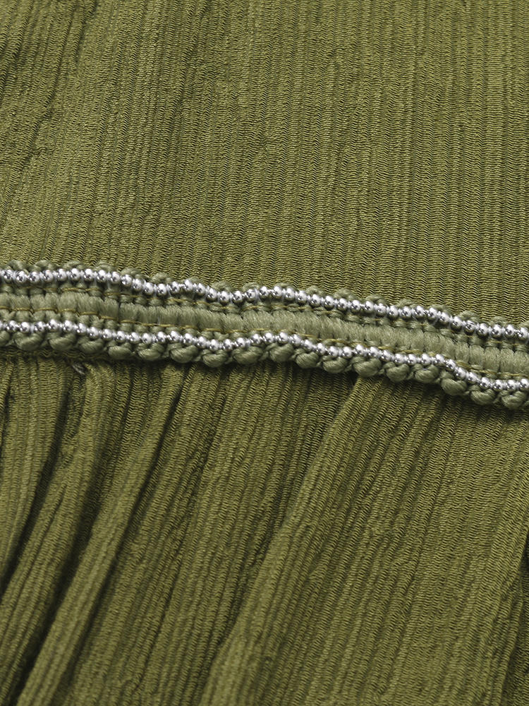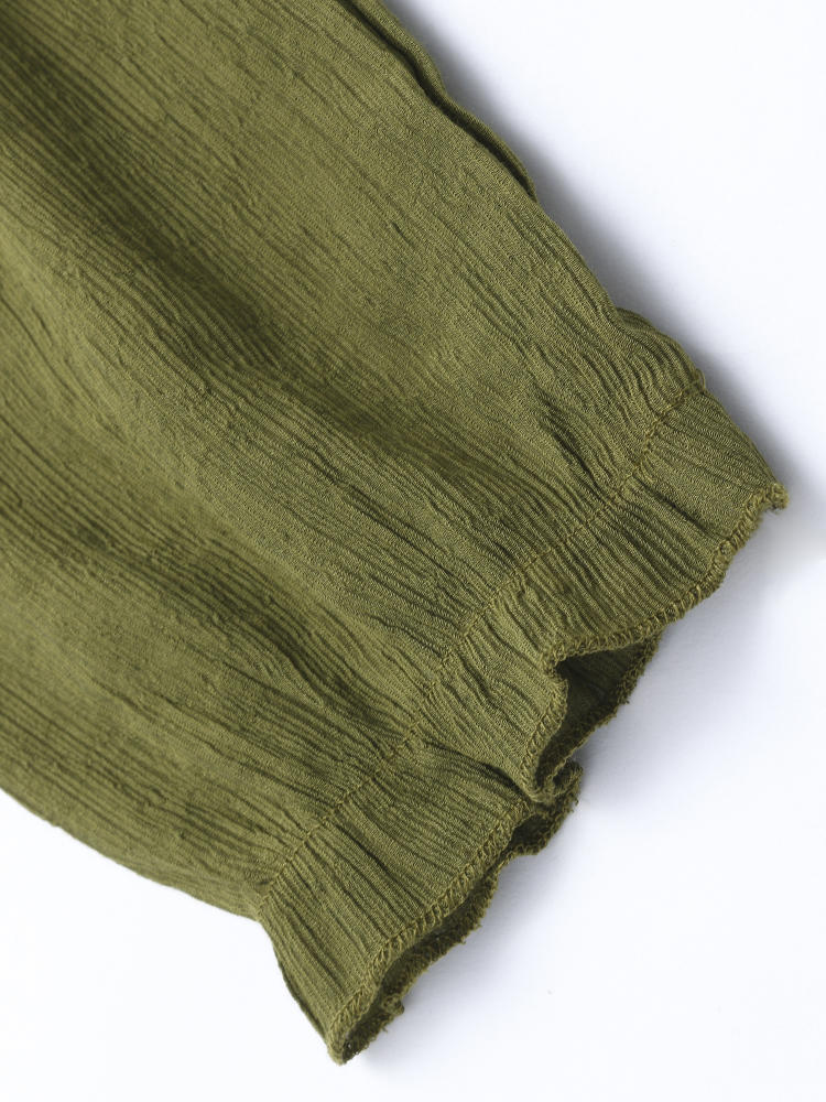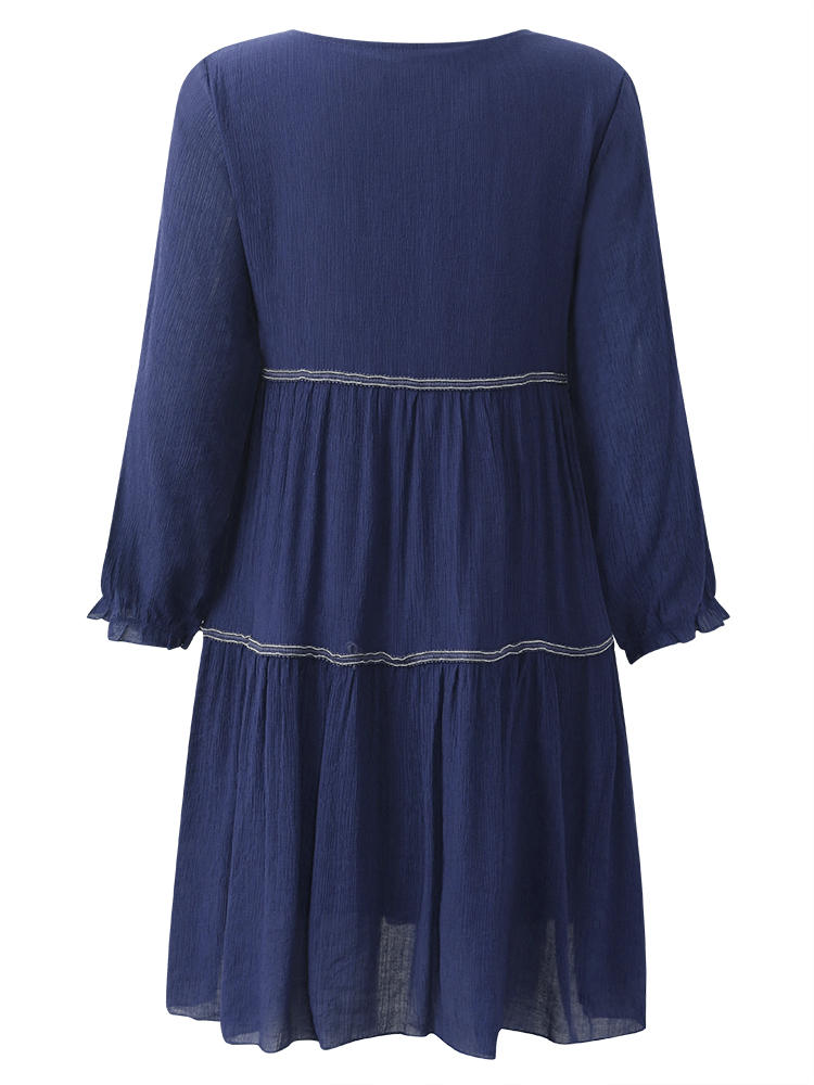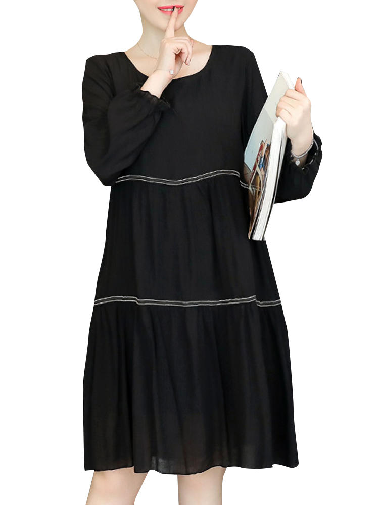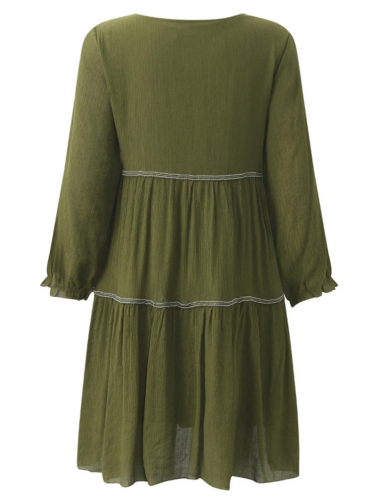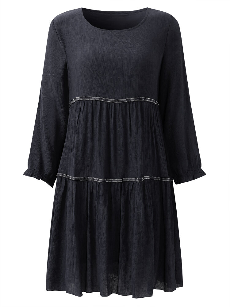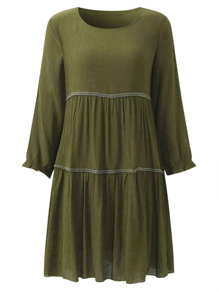 Casual Women Lantern Sleeve O-Neck Pure Color Pleated Dress