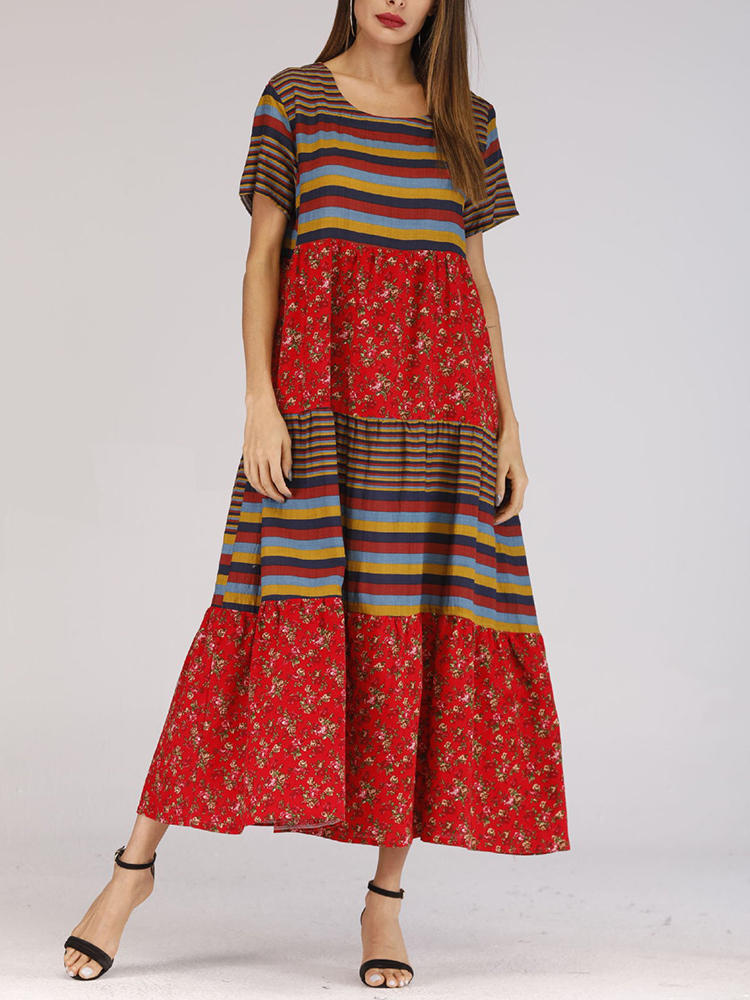 Abito lungo da donna a maniche corte in stile etnico o-collo COD